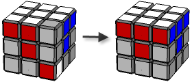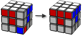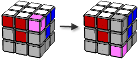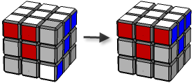 Als je de witte hoekblokjes uit de onderlaag in de bovenlaag hebt geplaatst, kunnen er nog hoekblokjes verkeerd zitten in de bovenlaag. Dit zijn witte hoekblokjes die ofwel op de verkeerde plaats, ofwel verkeerd gedraaid zitten. Breng zo’n hoekblokje eerst naar de onderlaag met Formule 2.4.