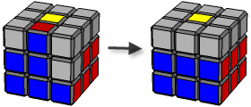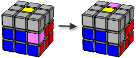Als je de randblokjes uit de bovenlaag in de middenlaag hebt geplaatst, kunnen er nog randblokjes verkeerd zitten in de middenlaag. Dit zijn randblokjes die ofwel op de verkeerde plaats, ofwel verkeerd gedraaid zitten. Breng zo’n randblokje eerst naar de bovenlaag met Formule 3.3.